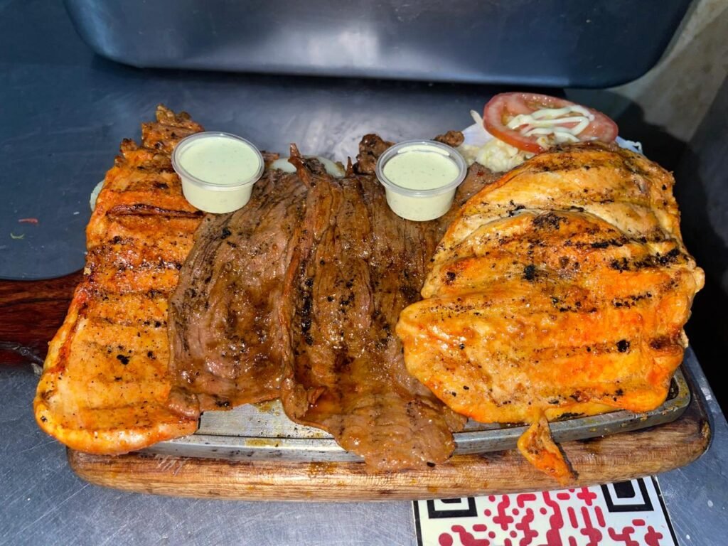 Carne de res, carne de cerdo, costilla, filete de pollo, chorizo de rica, ensalada, papas al vapor, arepas, salsas de la casa y rodajas de maduro.